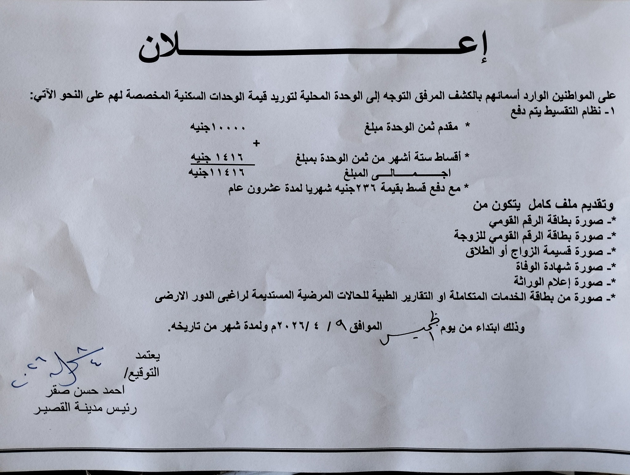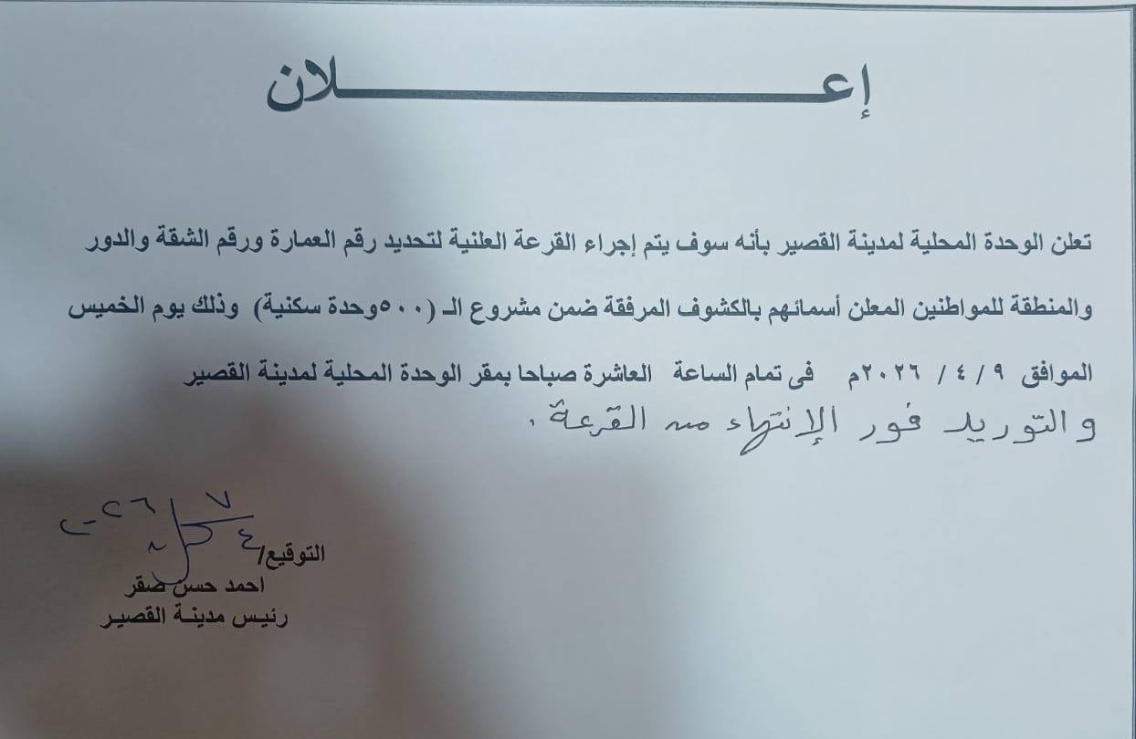 إجراء القرعة العلنية ضمن مشروع تسكين 500 وحدة سكنية بمدينة القصير .