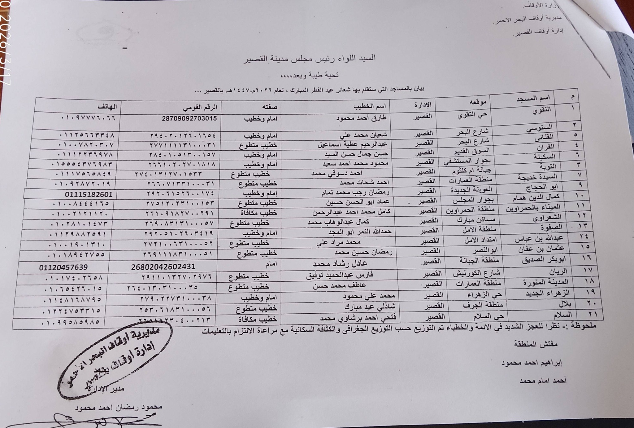 بيان صادر من إدارة أوقاف القصير بالساحات والمساجد التى سيقام فيها شعائر صلاة عيد الفطر المبارك